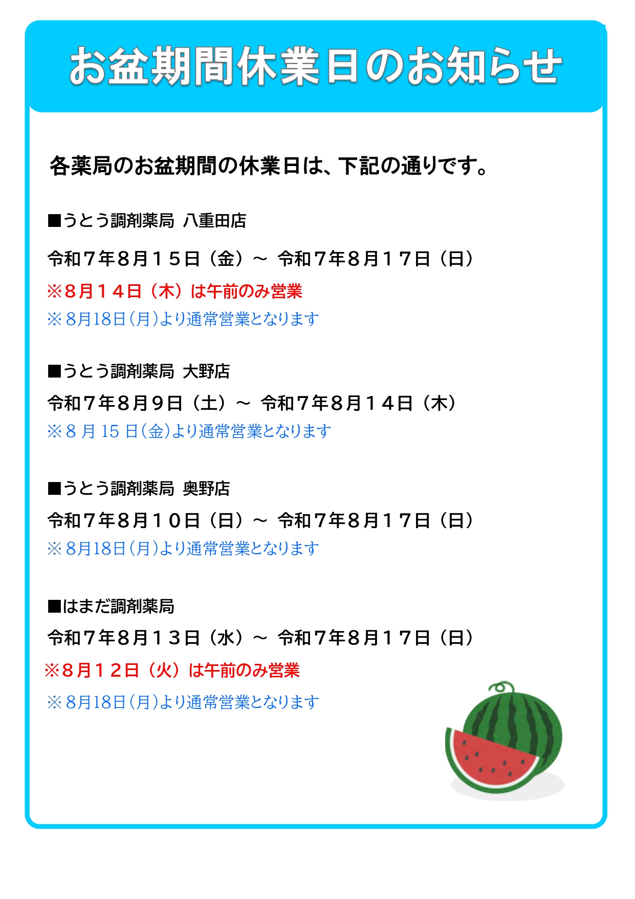 お盆期間中の休業日のお知らせ